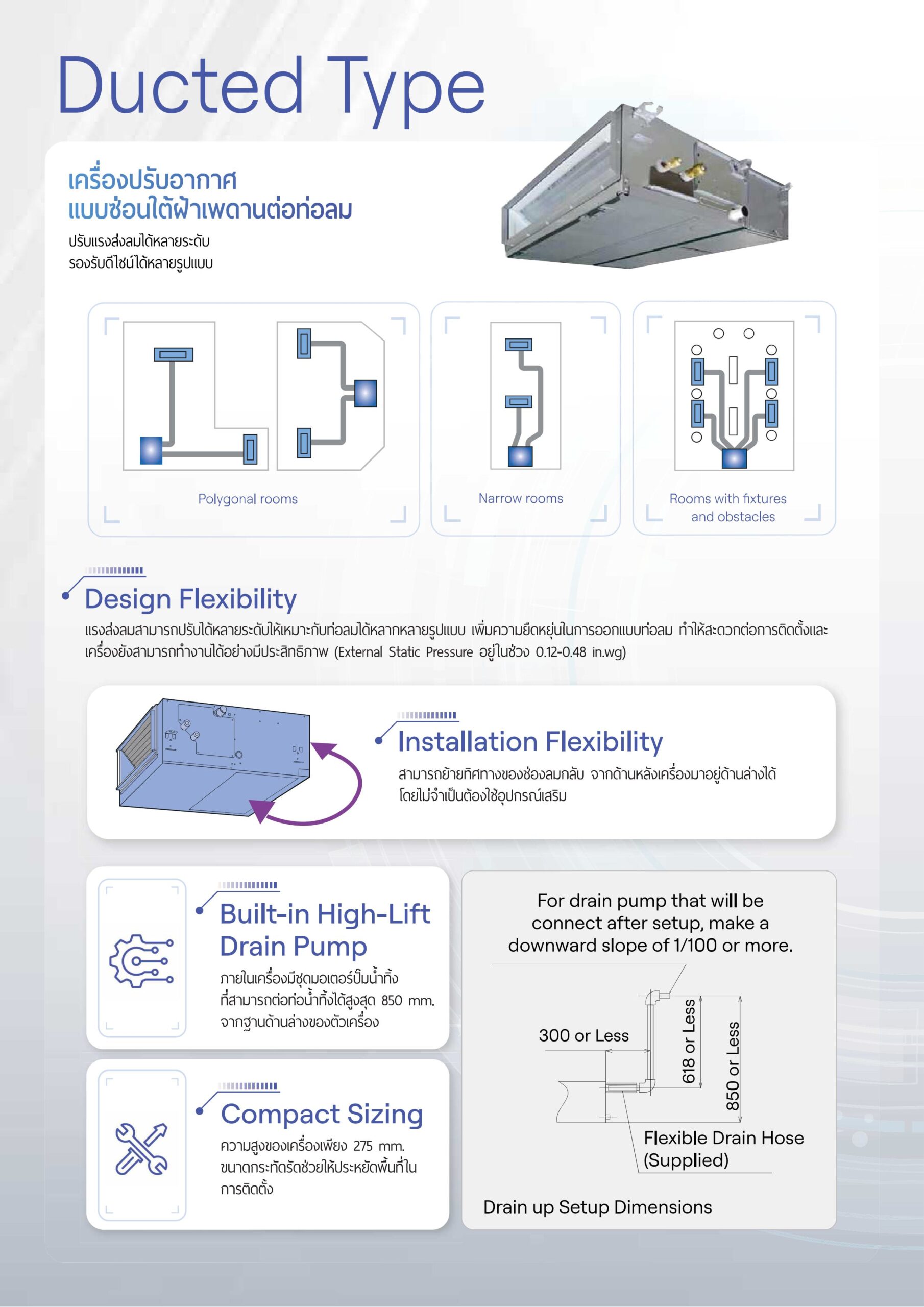 The Ducted-Type Air Conditioner allows for the convenient installation of air vents anywhere on the ceiling using ducting. This minimizes the visibility of the air conditioner. It is not only suitable for a wide variety of areas, from narrow spaces to various large rooms, but also greatly enhances the room’s aesthetics with its suitable appearance.